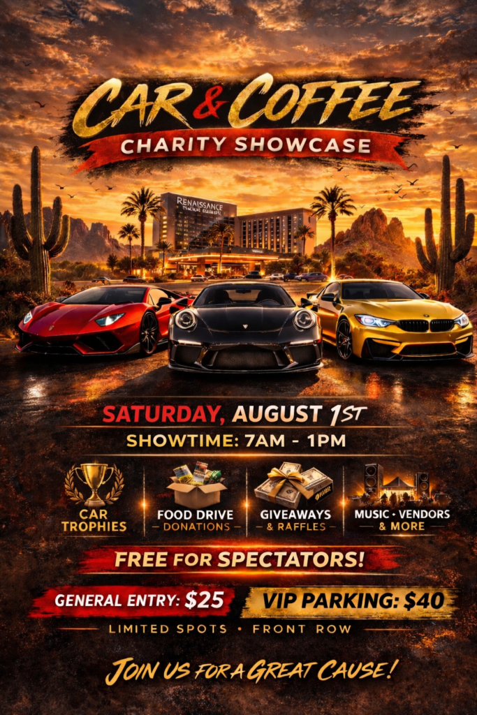 We’re hosting a Car & Coffee Charity Showcase alongside our Tattoo Expo on Saturday, August 1st at the Renaissance Phoenix Glendale. Co-hosted by Wrapsesh. Come show off your build, meet other car lovers, enjoy music + vendors, enter raffles, and support a great cause with our non-perishable food drive.